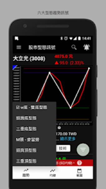 這六種主要型態包括雙底、三底、頭肩底、M頂、頭肩頂和三頂。通過價格趨勢圖識別這些型態,並用於預測股票未來的價格變動和方向。例如,簡單的W底型態是一個買入信號(僅供參考),在持續價格上漲之前形成,而M頂型態是一個賣出信號(僅供參考),在持續價格下跌之前形成。有關更多詳細信息,用戶可以參考該應用程式的專有術語介紹。